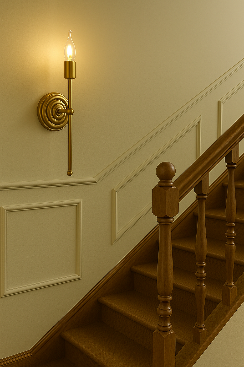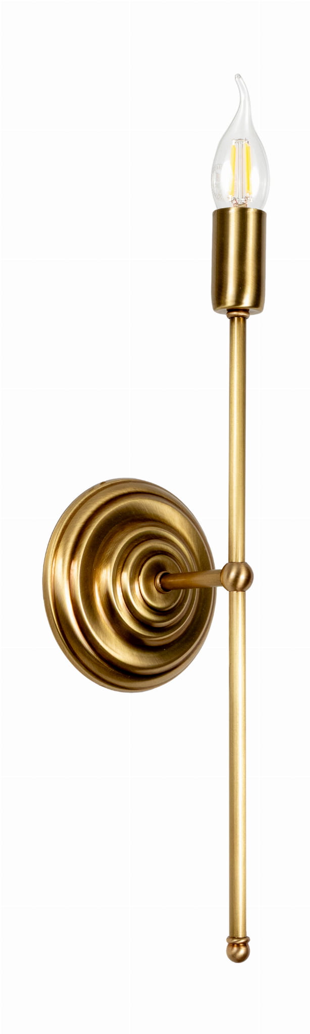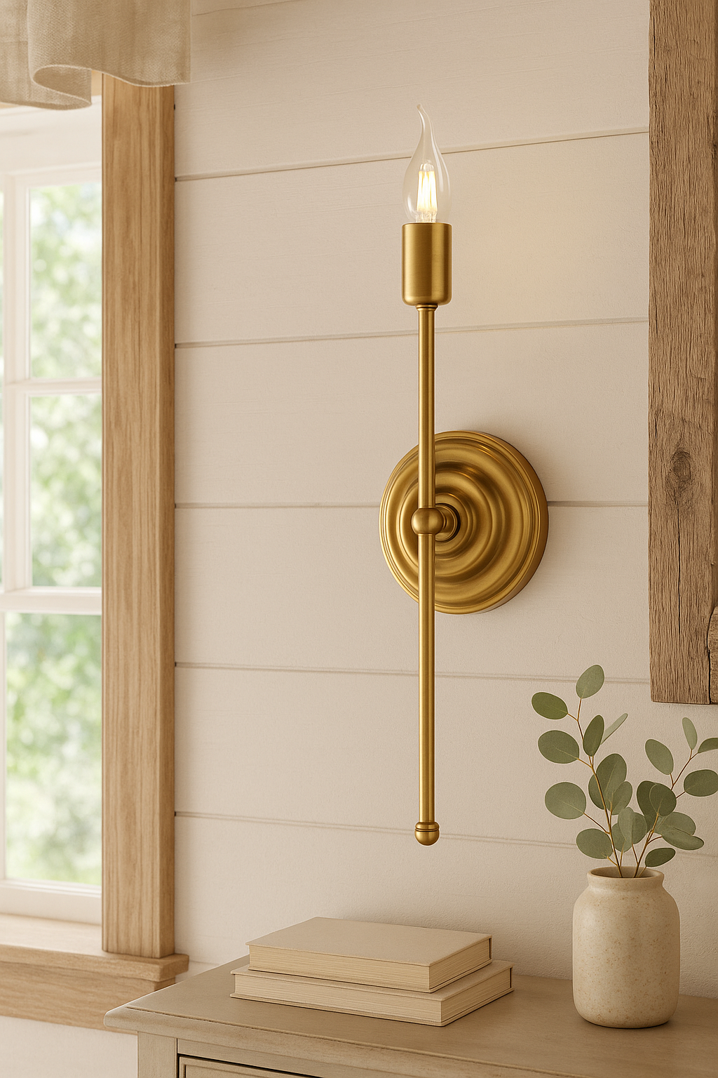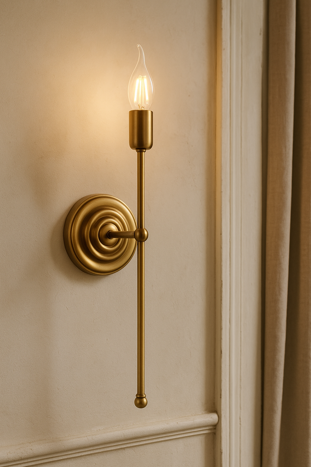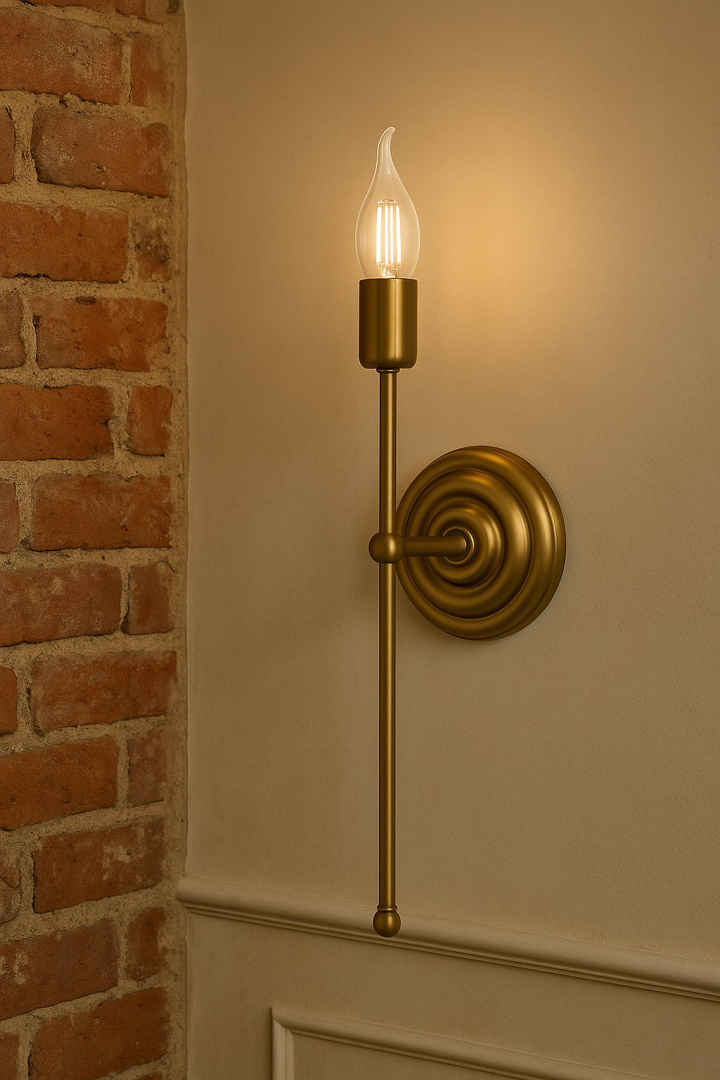 Dodaj wyjątkowego charakteru swojemu wnętrzu dzięki eleganckiemu kinkietowi ściennemu wykonanemu z wysokiej jakości mosiądzu. Ten stylowy kinkiet w kolorze złotym to doskonałe połączenie klasyki z nowoczesnym designem. Smukła forma, inspirowana świecą, oraz subtelne wykończenie sprawiają, że idealnie wpisuje się zarówno w aranżacje w stylu domku wiejskiego (farmhouse), jak i wnętrz klasycznych, retro czy glamour.
