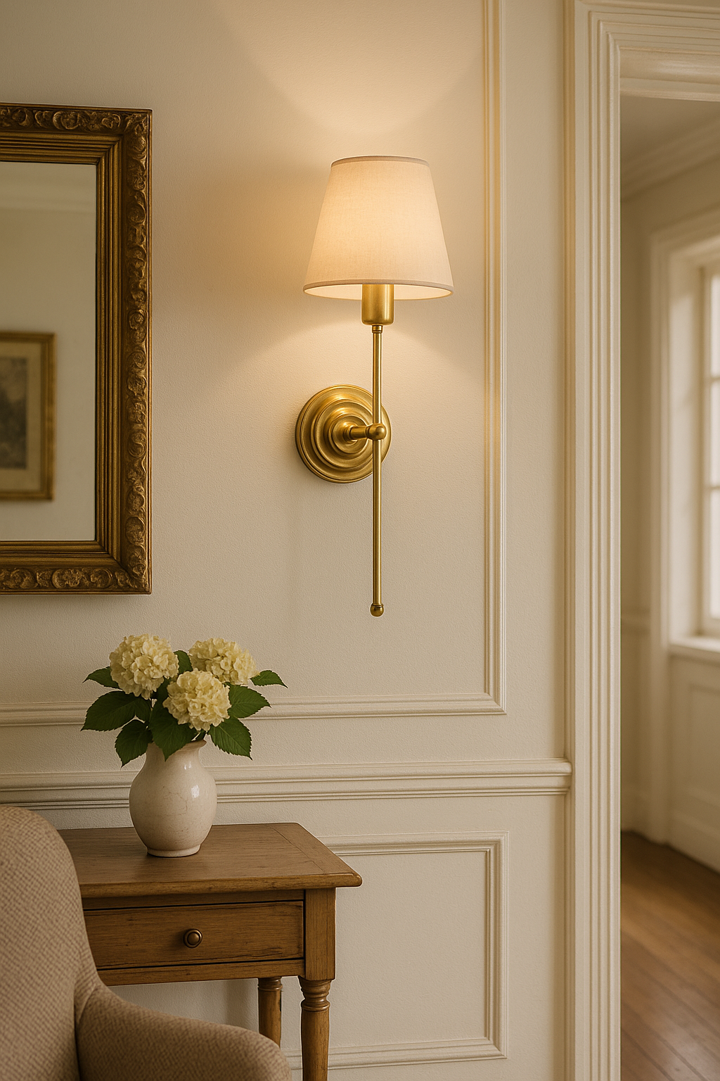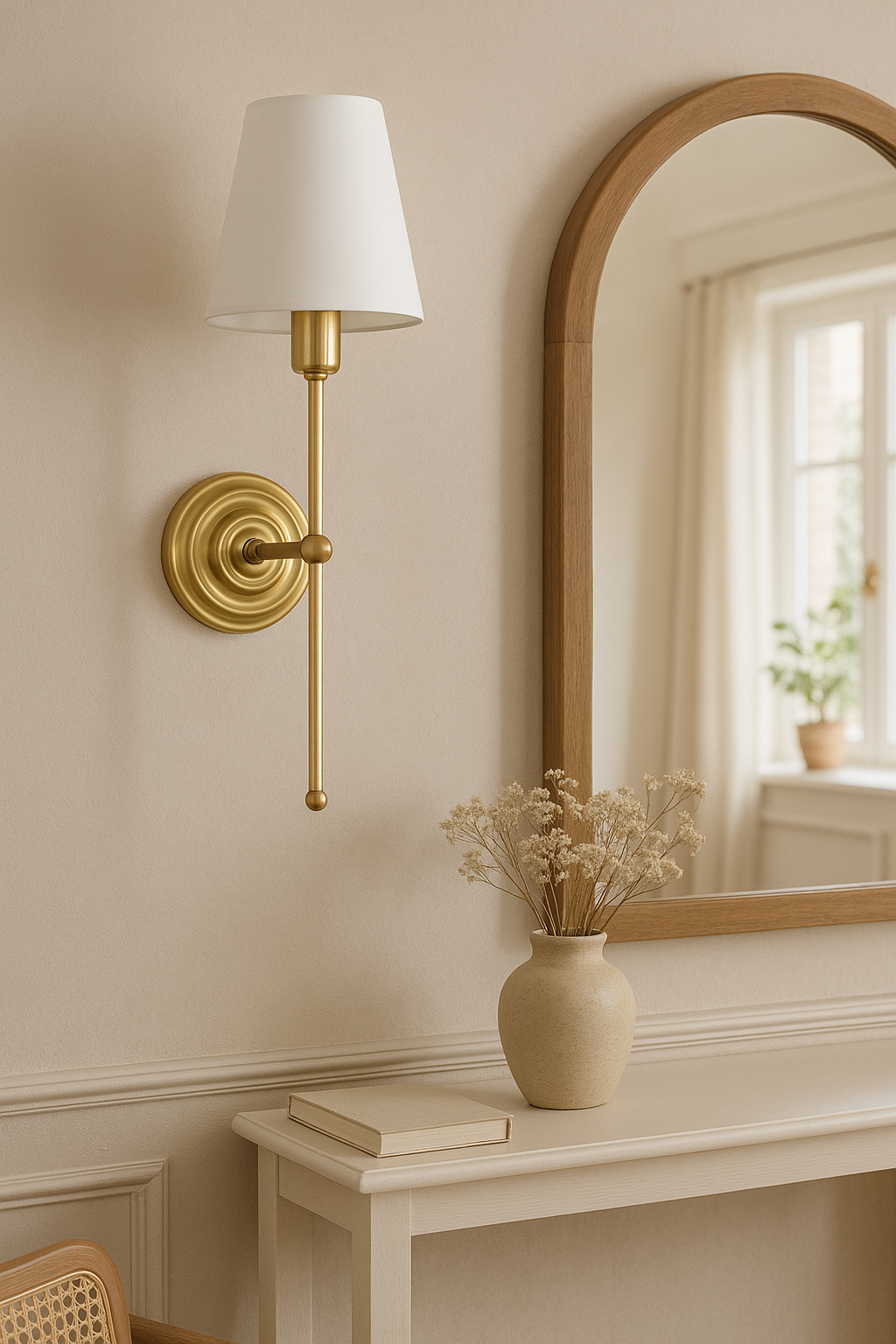 Wprowadź do swojego wnętrza nutę elegancji i ponadczasowego stylu dzięki kinkietowi ściennemu w stylu retro. Ten wyjątkowy kinkiet ścienny z mosiężnym wykończeniem i klasycznym, stożkowym abażurem, to idealne rozwiązanie do aranżacji w stylu vintage, klasycznym czy glamour.