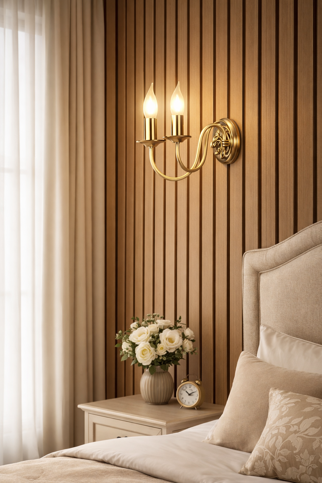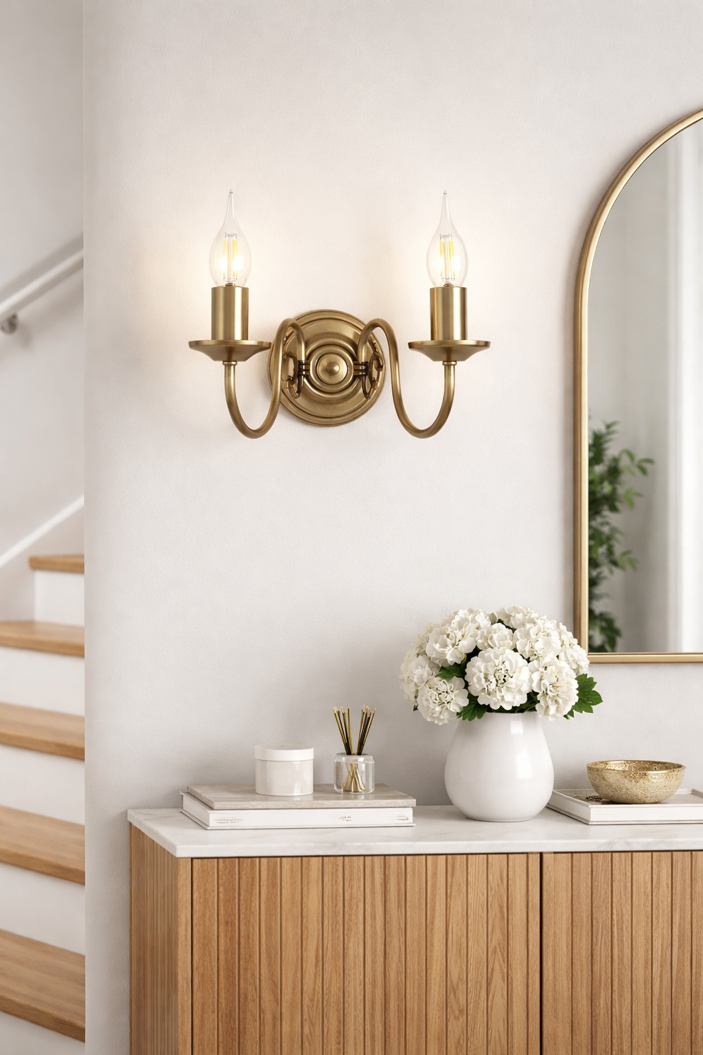 Dwupunktowy kinkiet z mosiądzu, lampa ścienna mosiężna świeczkowa Flamand.