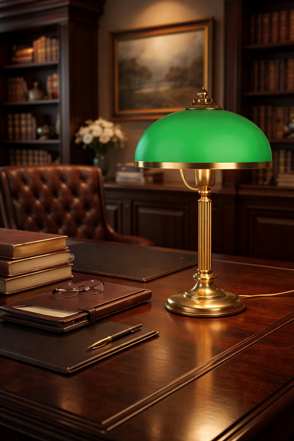 Mosiężna lampa gabinetowa - ponadczasowa elegancja dla miłośników stylu klasycznego. Do produkcji wykorzystujemy elementy pochodzenia polskiego. Klosz szklany z polskiej huty szkła, dostępny w kolorze biały mat, biały połysk, zielony mat, zielony połysk. Oferujemy lampy z prawdziwego mosiądzu, nie jest to stal stylizowana na mosiądz.