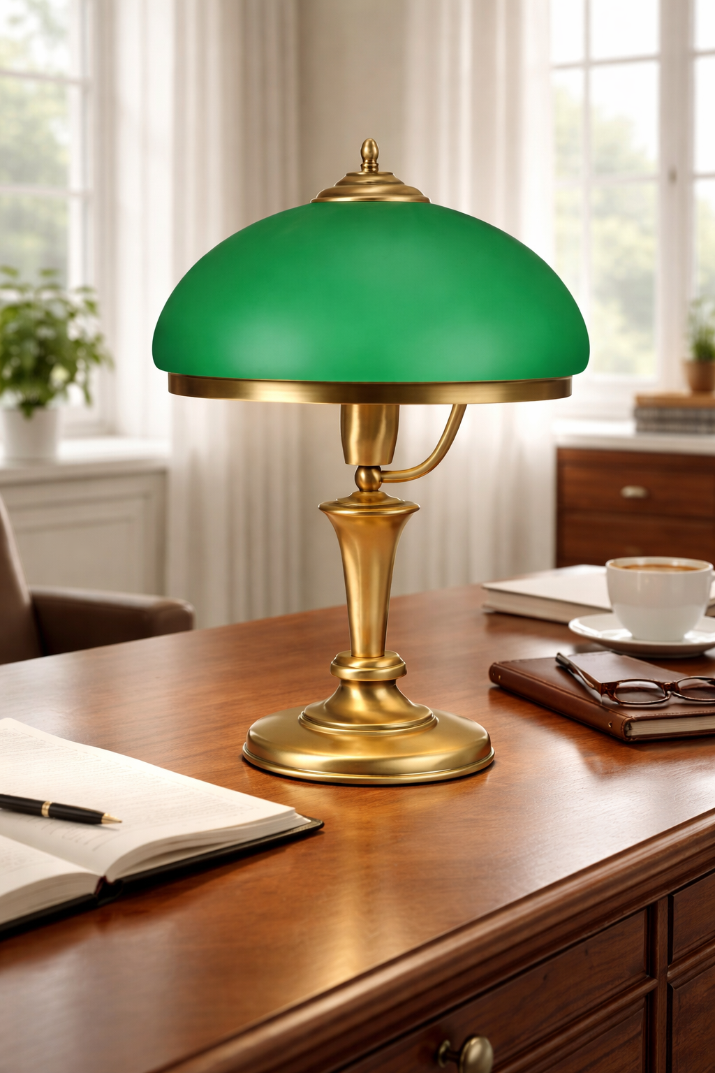 Patynowana lampa gabinetowa z mosiądzu - ponadczasowa elegancja dla miłośników stylu klasycznego. Do produkcji wykorzystujemy elementy pochodzenia polskiego. Klosz szklany z polskiej huty szkła , dostępny w kolorze biały mat, biały połysk, zielony mat, zielony połysk. Oferujemy lampy z prawdziwego mosiądzu, nie jest to stal stylizowana na mosiądz.