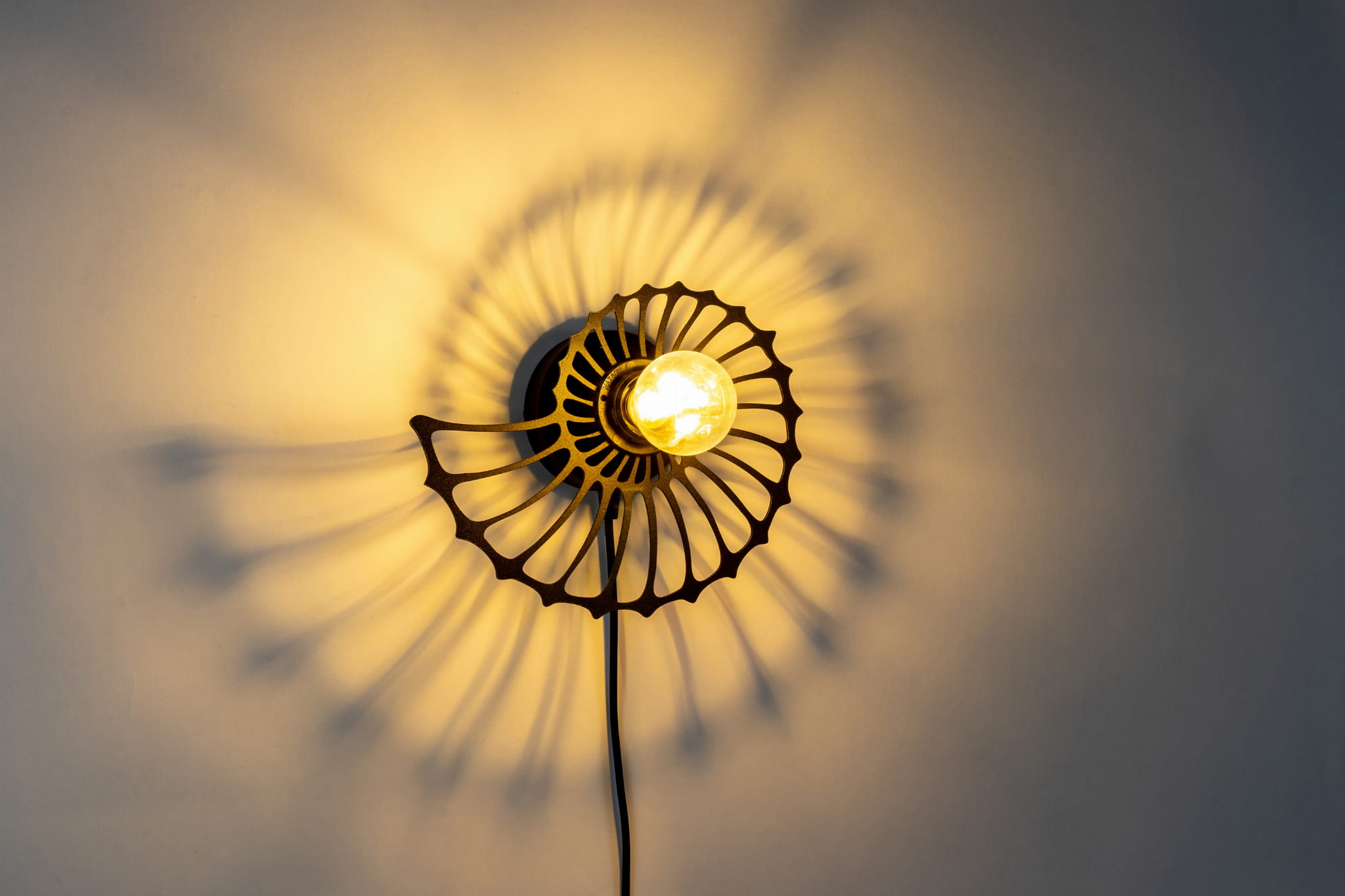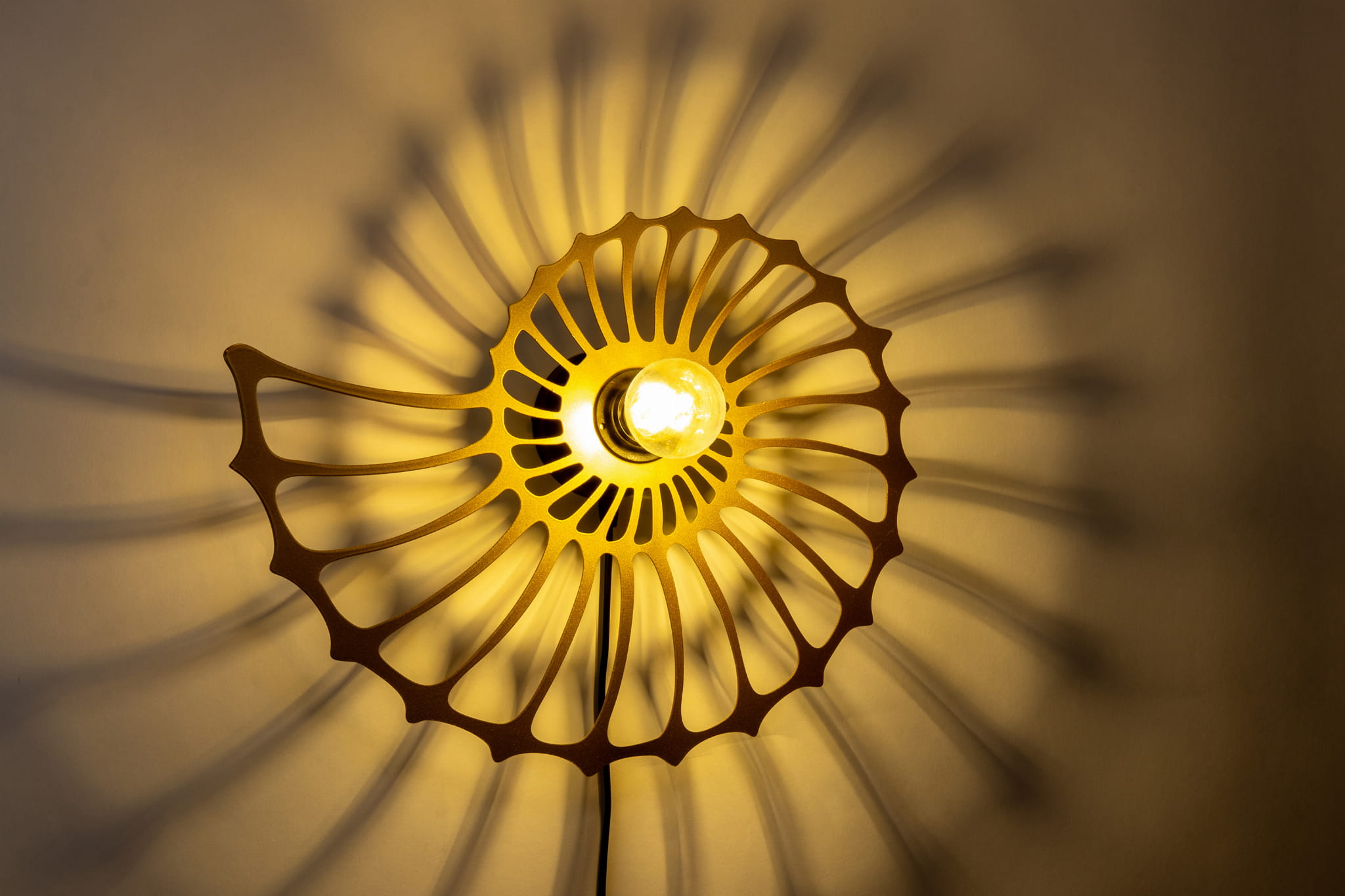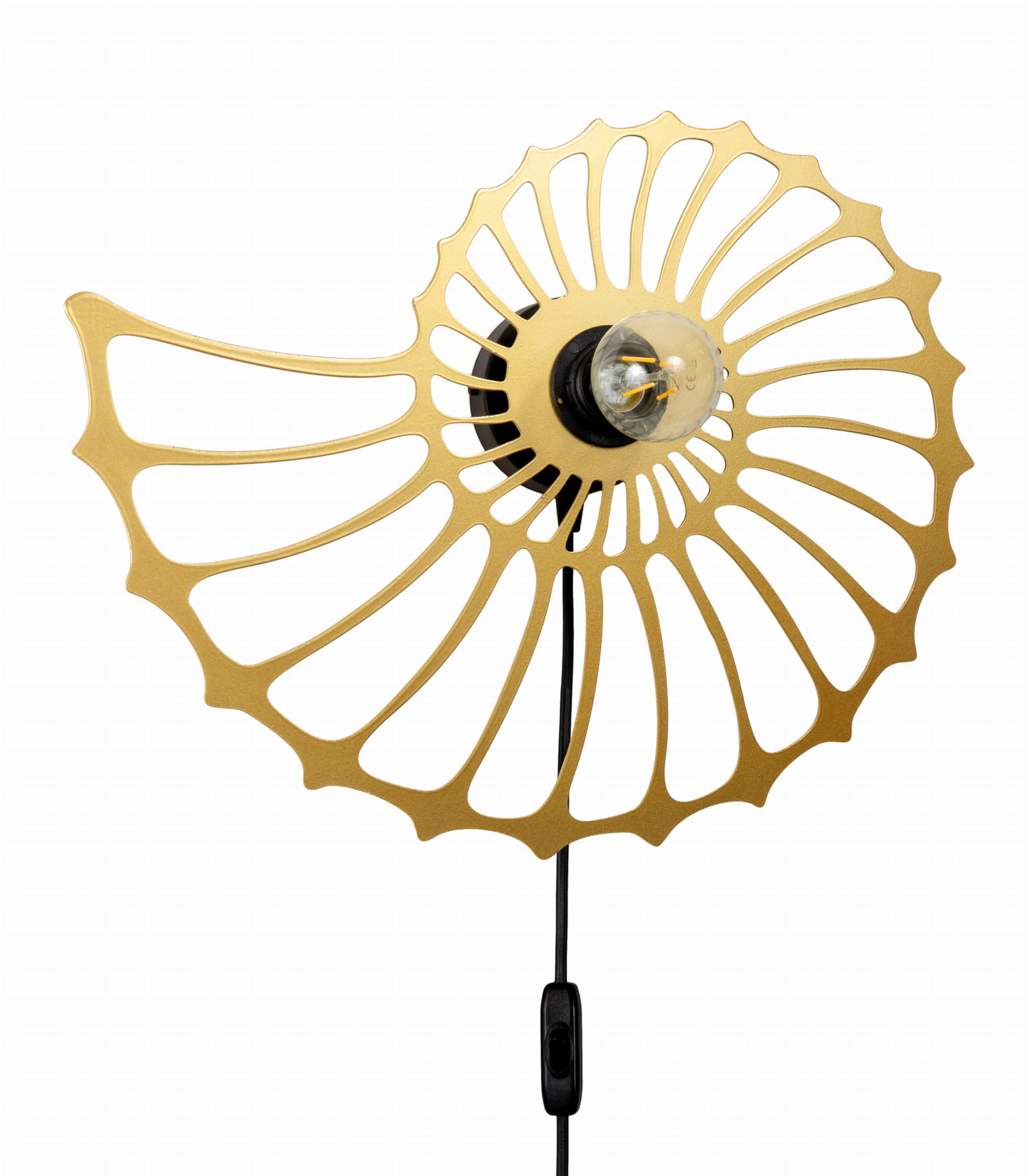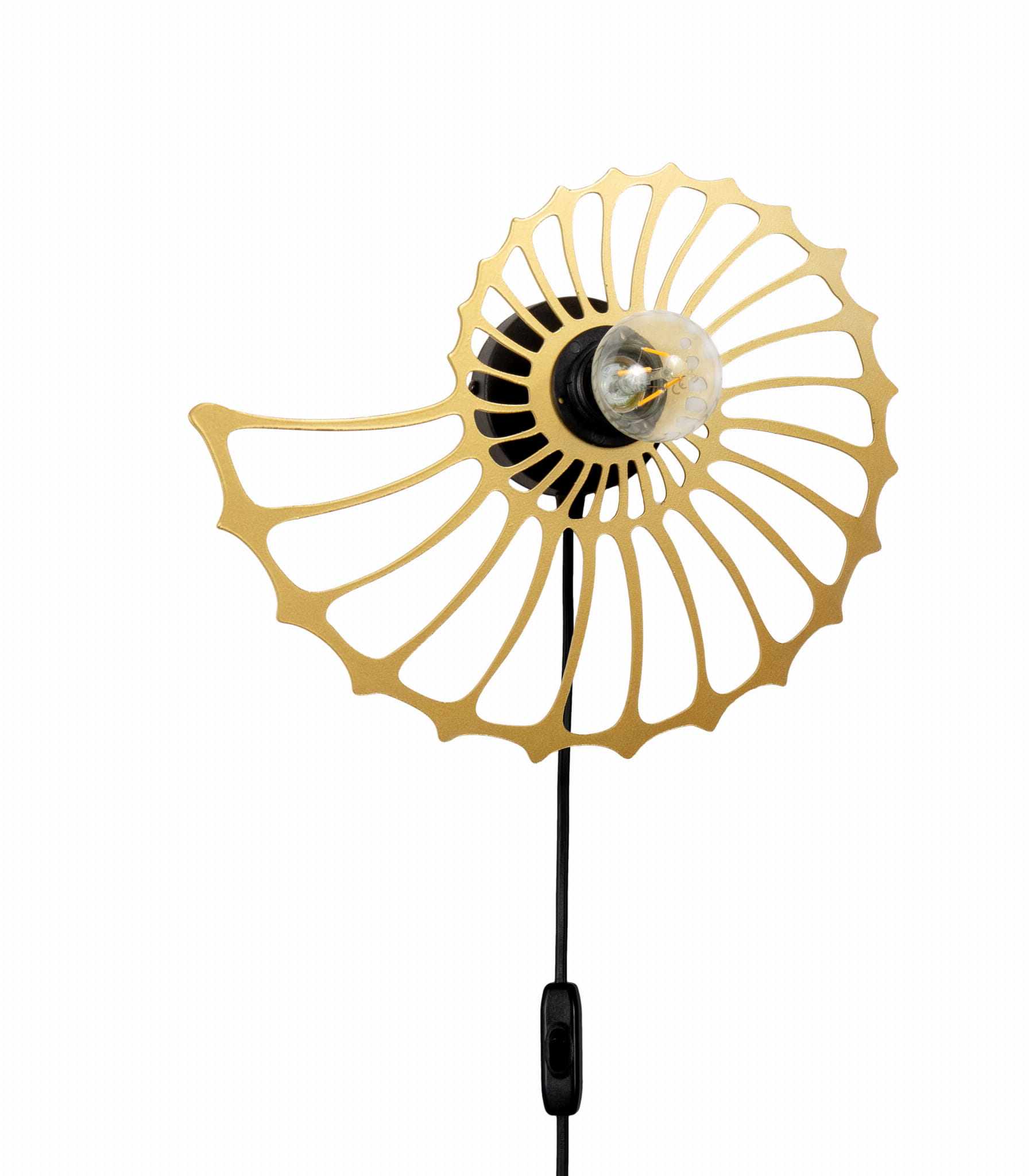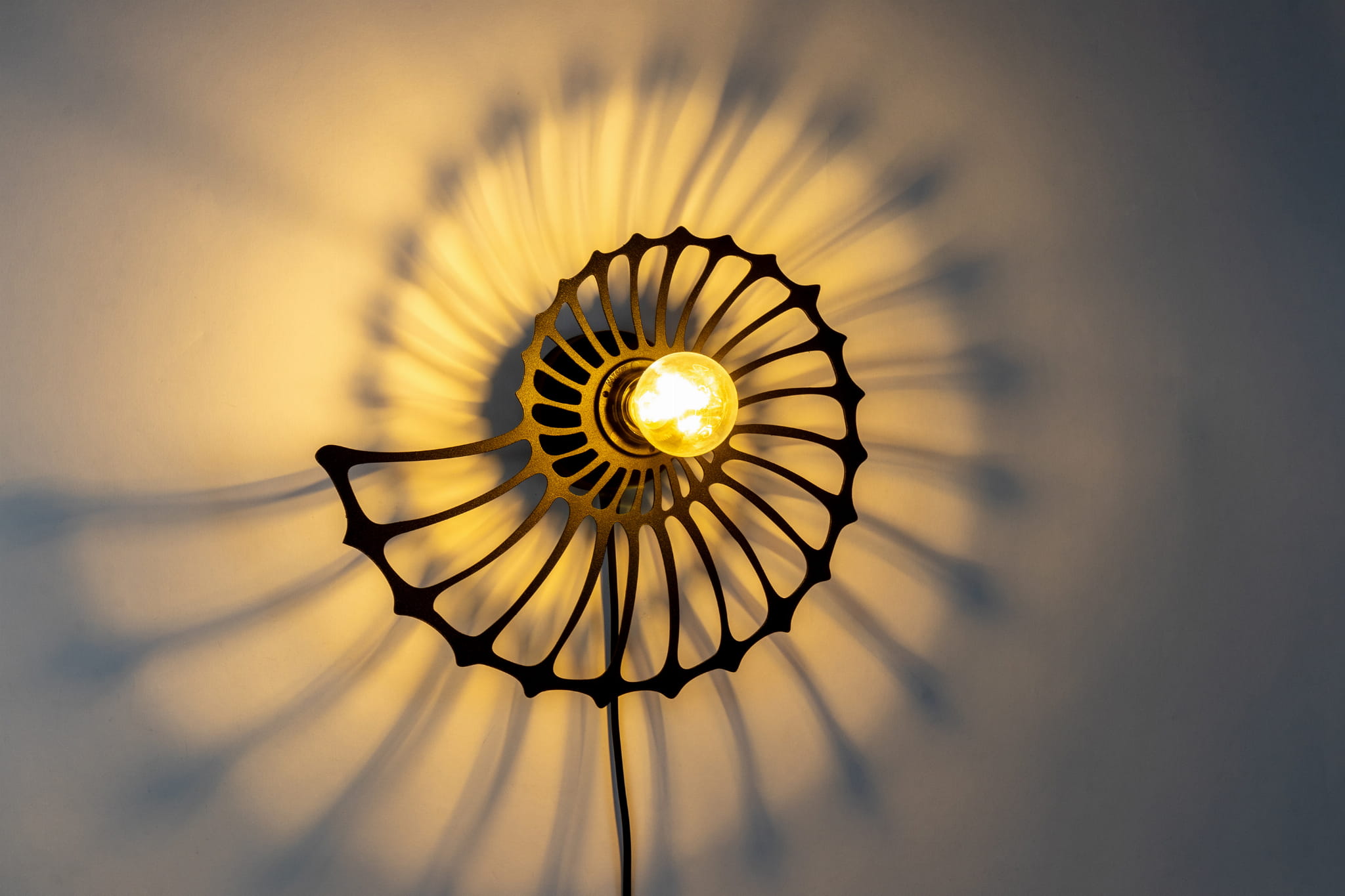 Lampa ścienna Amonit to niezwykłe oświetlenie, które odmieni każde wnętrze. Jej piękny klosz w kształcie ślimaka sprawia, że jest to nie tylko lampa, ale również designerski element dekoracyjny. Dzięki przyjemnemu światłu, które rozprasza się delikatnie przez metalowe wycięcia klosza, mamy niepowtarzalną atmosferę zarówno w salonie, jak i sypialni. Dzięki zamontowanemu kablowi z wtyczką możesz ją zamontować gdzie tylko chcesz. Przy kąciku do czytania, czy przy stoliku kawowym.