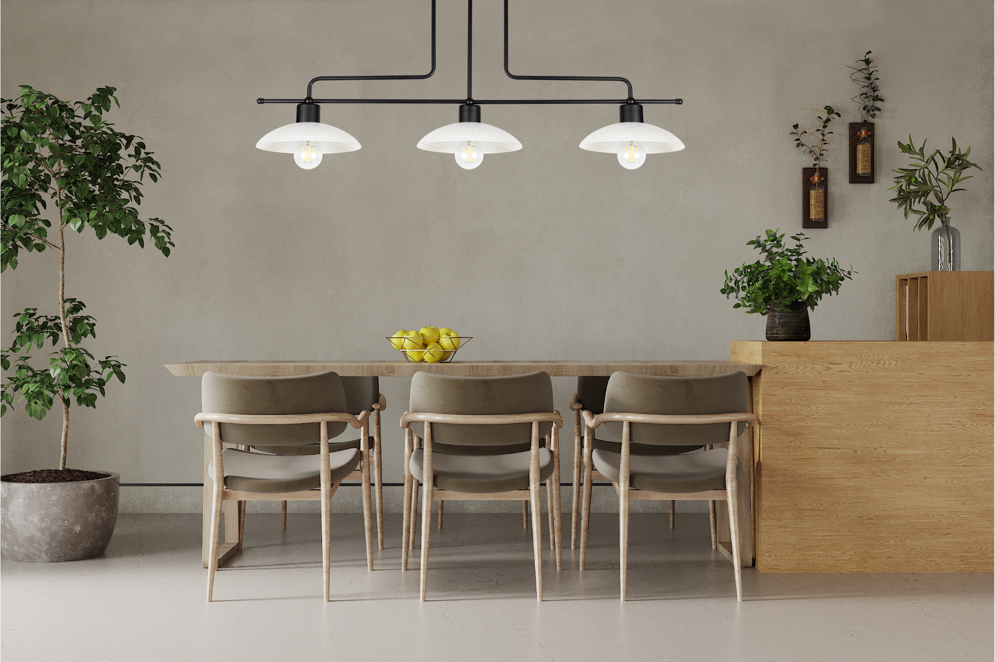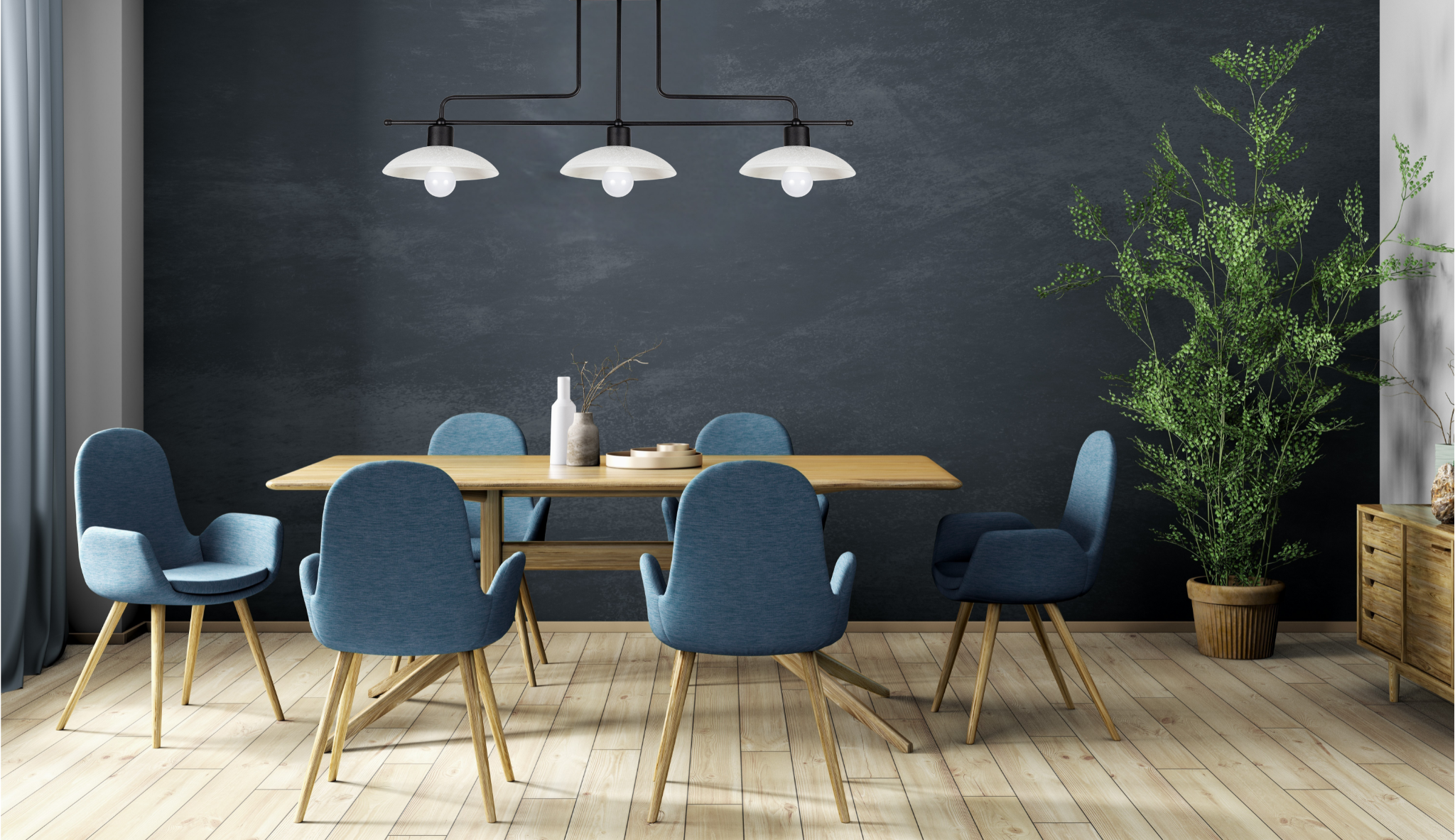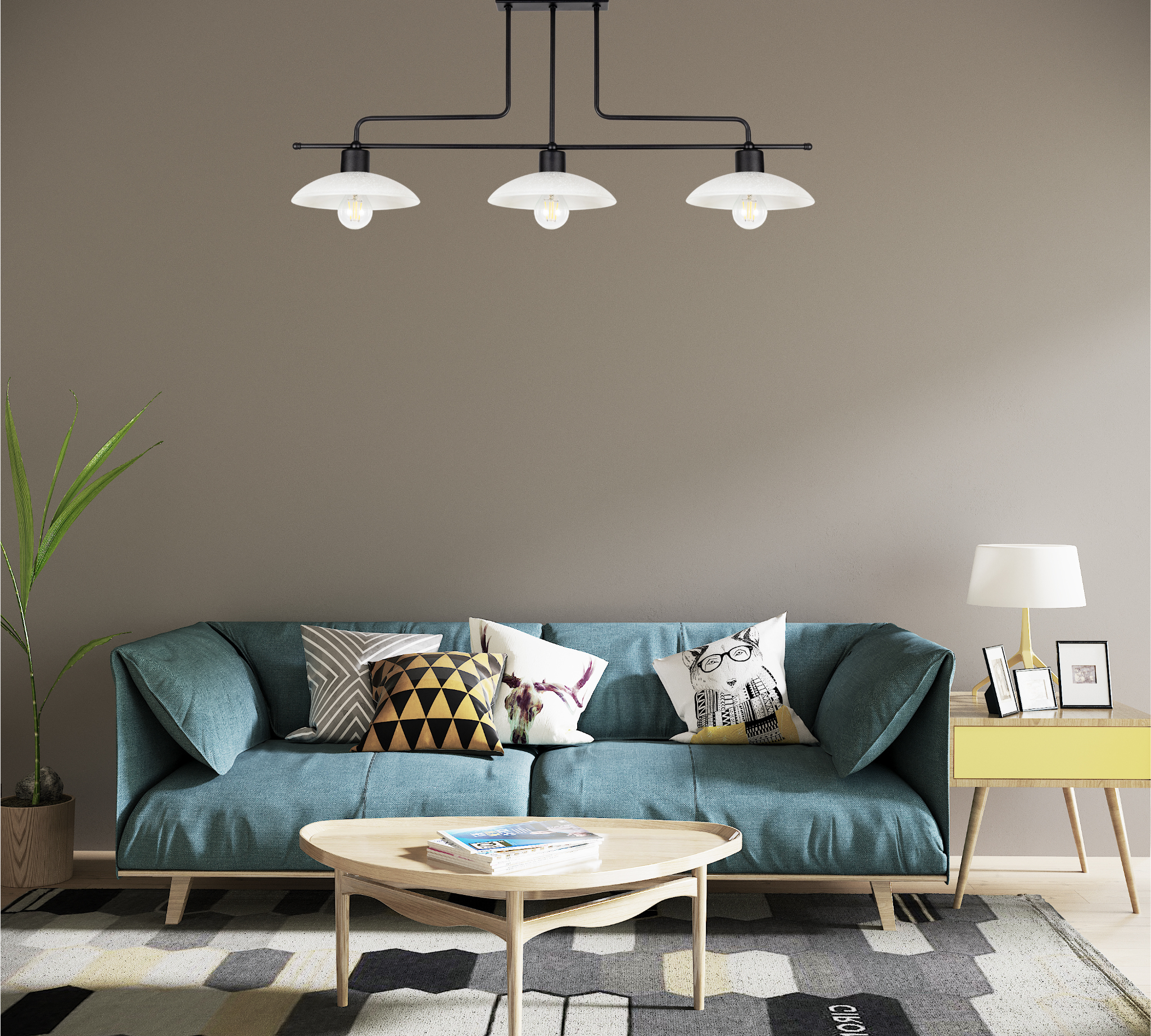 Lampa prezentuje się doskonale zarówno w surowych, loftowych przestrzeniach, jak i we wnętrzach w stylu skandynawskim czy retro. Trzy punkty świetlne zapewniają optymalne oświetlenie nawet większych pomieszczeń.