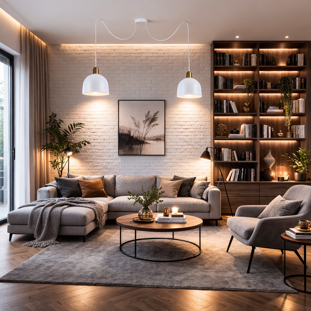 Ściany: Biel, jasna szarość lub ciepły beż dla harmonii; opcjonalnie ściana akcentowa w ciemniejszym kolorze.