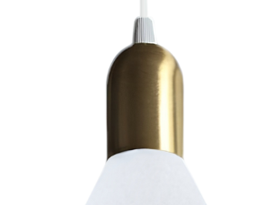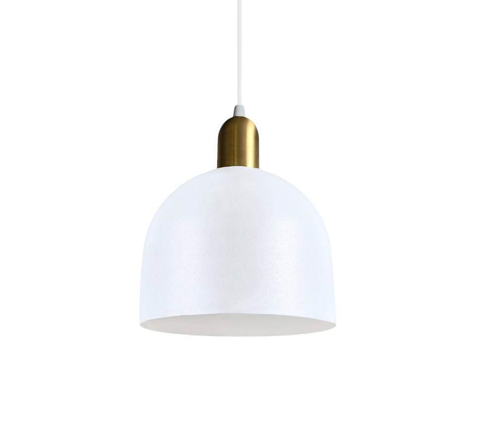 Nowoczesny design – minimalistyczne, półokrągłe klosze w kolorze białym z eleganckim złotym wykończeniem.