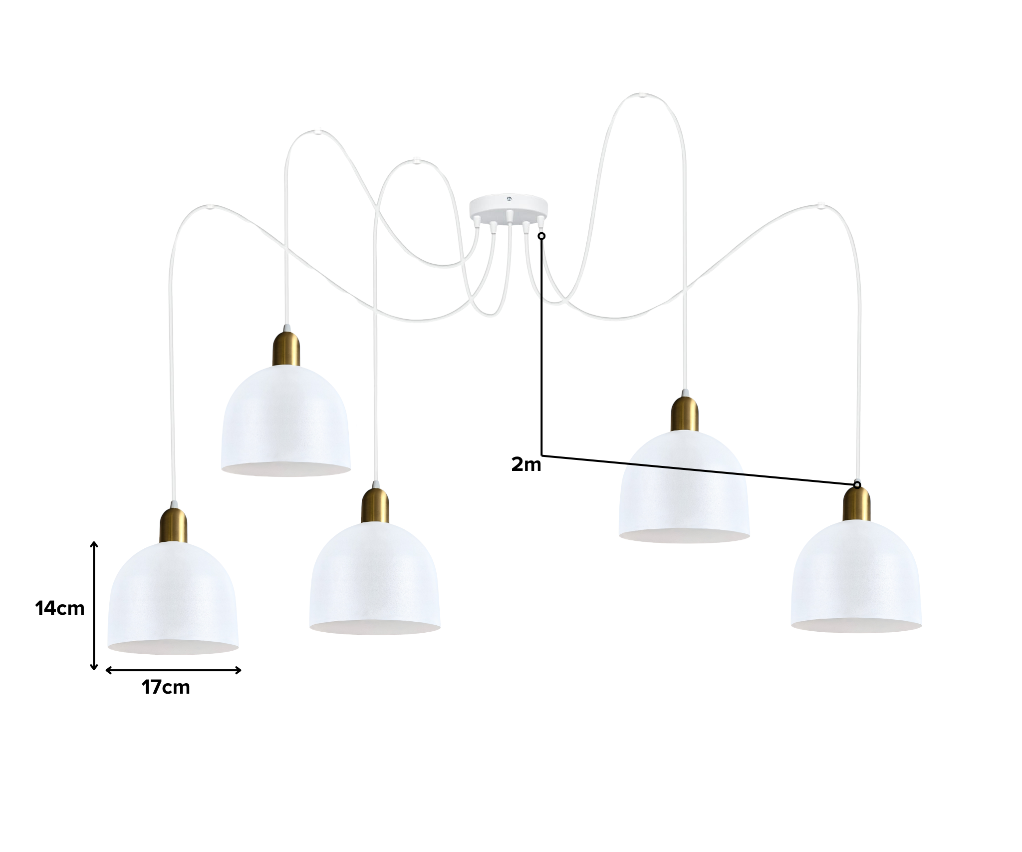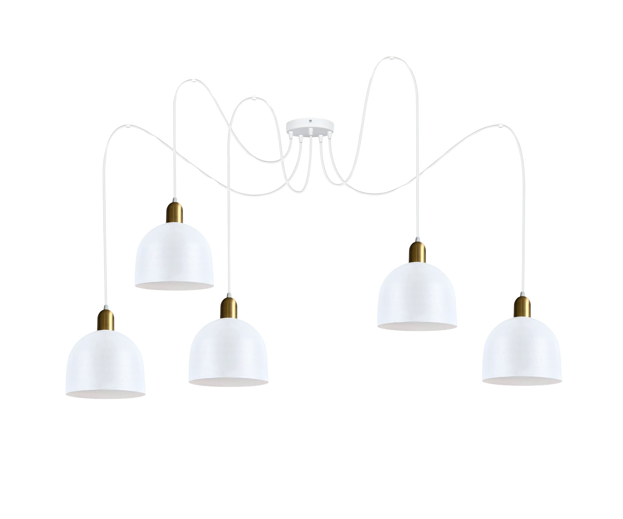 Dodaj elegancji i funkcjonalności swojemu wnętrzu dzięki tej białej lampie wiszącej. Nowoczesny design z pięcioma metalowymi kloszami w kształcie kopuły doskonale sprawdzi się w jadalni, nad wyspą kuchenną czy w salonie. Zaczepy sufitowe pozwalają na dowolne rozmieszczenie punktów z żarówką, tak aby oświetlić potrzebną przestrzeń.