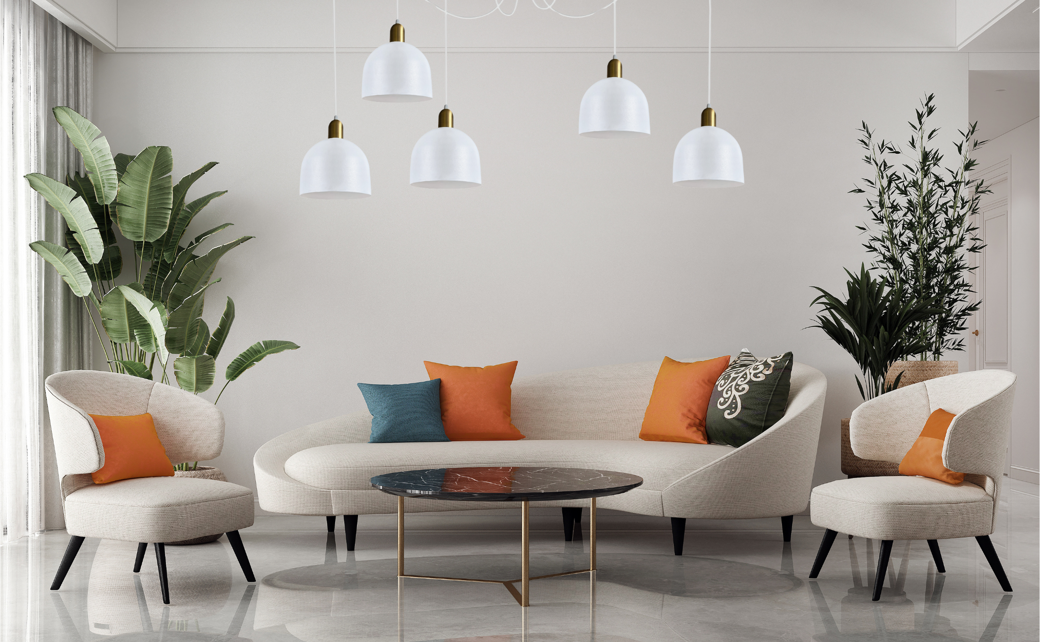 • Dodatki: Rośliny doniczkowe, ceramiczne wazony i złote detale, które nawiązują do wykończenia lampy.