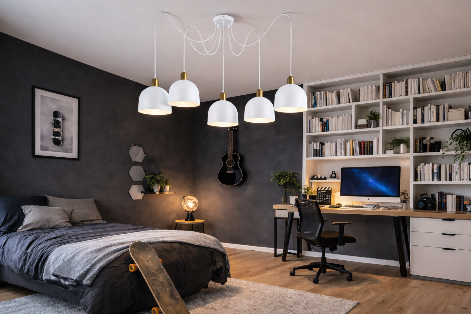 Aby stworzyć harmonijną aranżację wnętrza z wykorzystaniem tej eleganckiej, nowoczesnej lampy wiszącej, warto dopasować jej styl do reszty pomieszczenia. Oto kilka propozycji aranżacji: