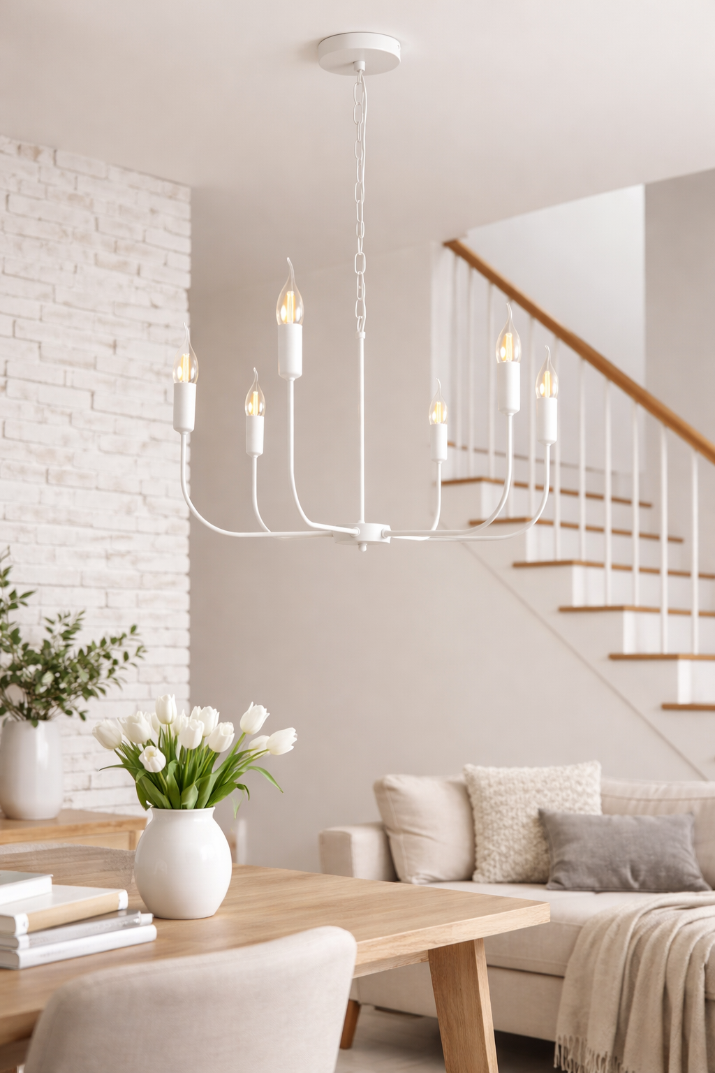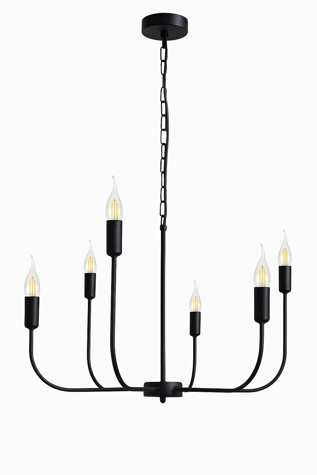 Dodaj wyjątkowy akcent do swojego wnętrza dzięki tej eleganckiej, 6-ramiennej lampie wiszącej. Wykonana z czarnego metalu, lampa zachwyca prostym, a zarazem wyrazistym designem, który doskonale wpisuje się w nowoczesne, skandynawskie lub loftowe aranżacje. Każde ramię zakończone jest dekoracyjnym punktem świetlnym w kształcie świeczki, co nadaje całości subtelnego charakteru.