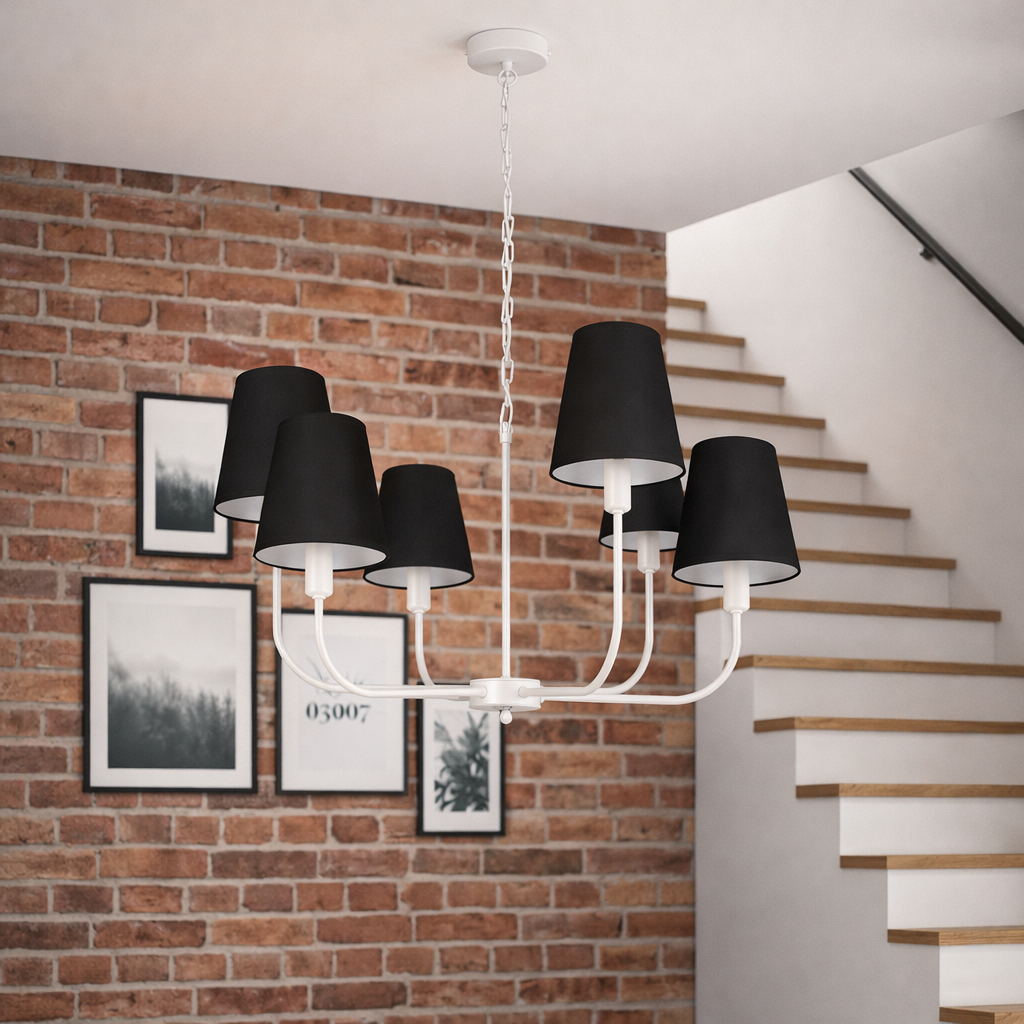 Czarna, metalowa konstrukcja stanowi wyrazisty, ale ponadczasowy kontrapunkt dla jasnych abażurów, dzięki czemu lampa doskonale odnajduje się zarówno w nowoczesnych przestrzeniach, jak i aranżacjach w stylu modern farmhouse, modern classic czy loft soft.
