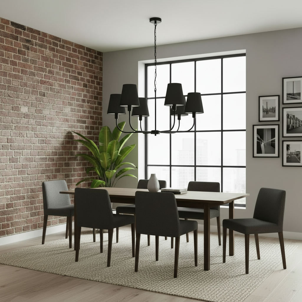 Modern farmhouse – idealne połączenie czarnej konstrukcji z materiałowymi abażurami harmonizuje z naturalnym drewnem, cegłą i jasnymi przestrzeniami