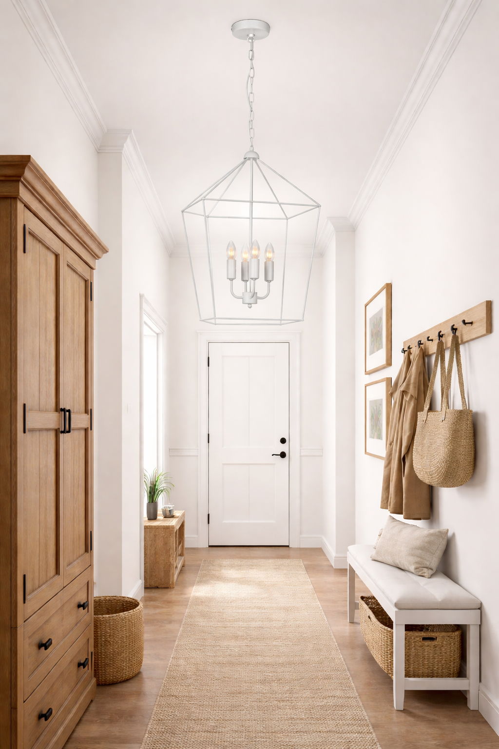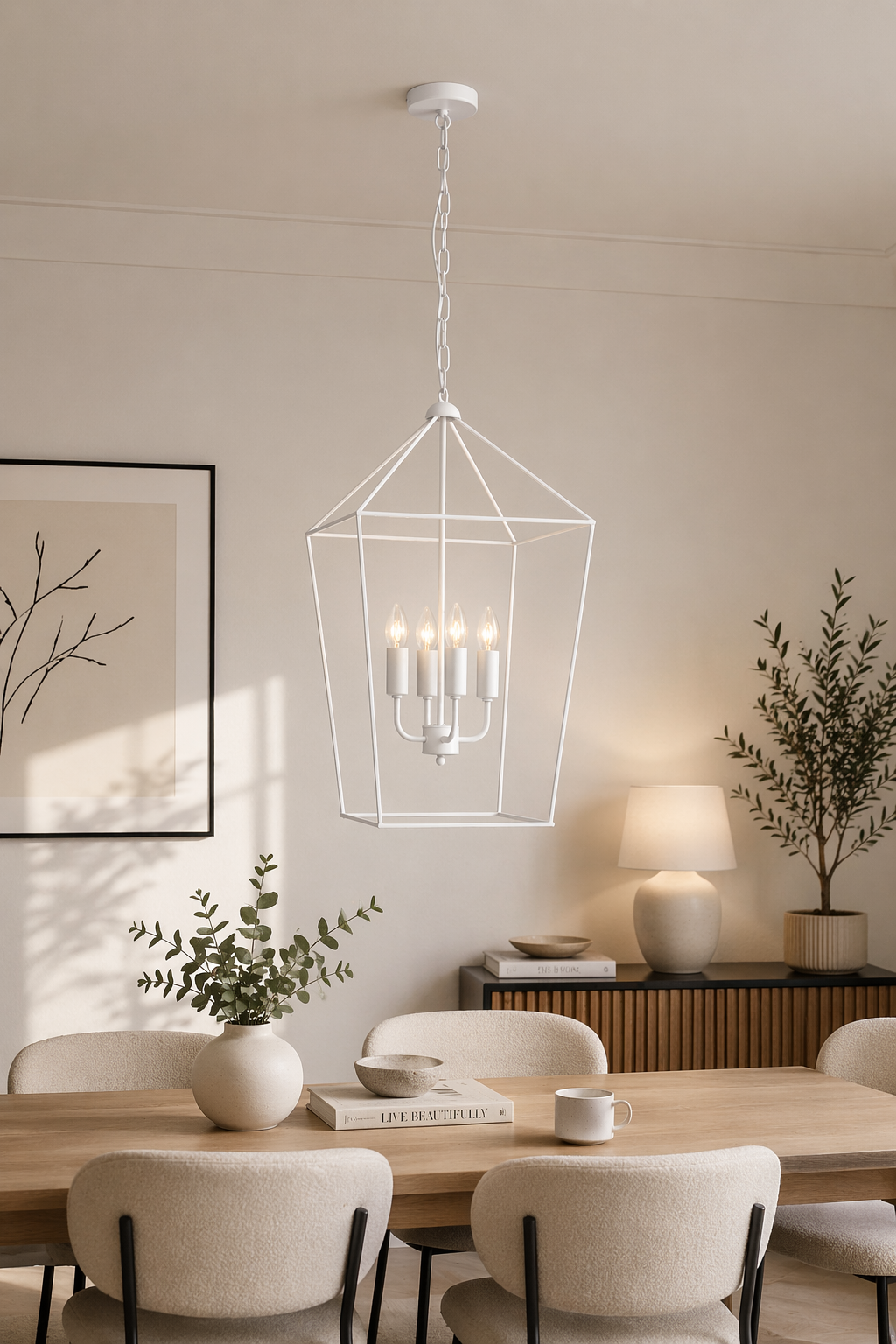 Cztery źródła światła umieszczone wewnątrz zapewniają równomierne i przyjemne oświetlenie, doskonale sprawdzając się zarówno w salonie, jadalni, jak i nad stołem w kuchni. Otwarta forma lampy pięknie eksponuje dekoracyjne żarówki, pozwalając stworzyć wyjątkowy klimat wnętrza.