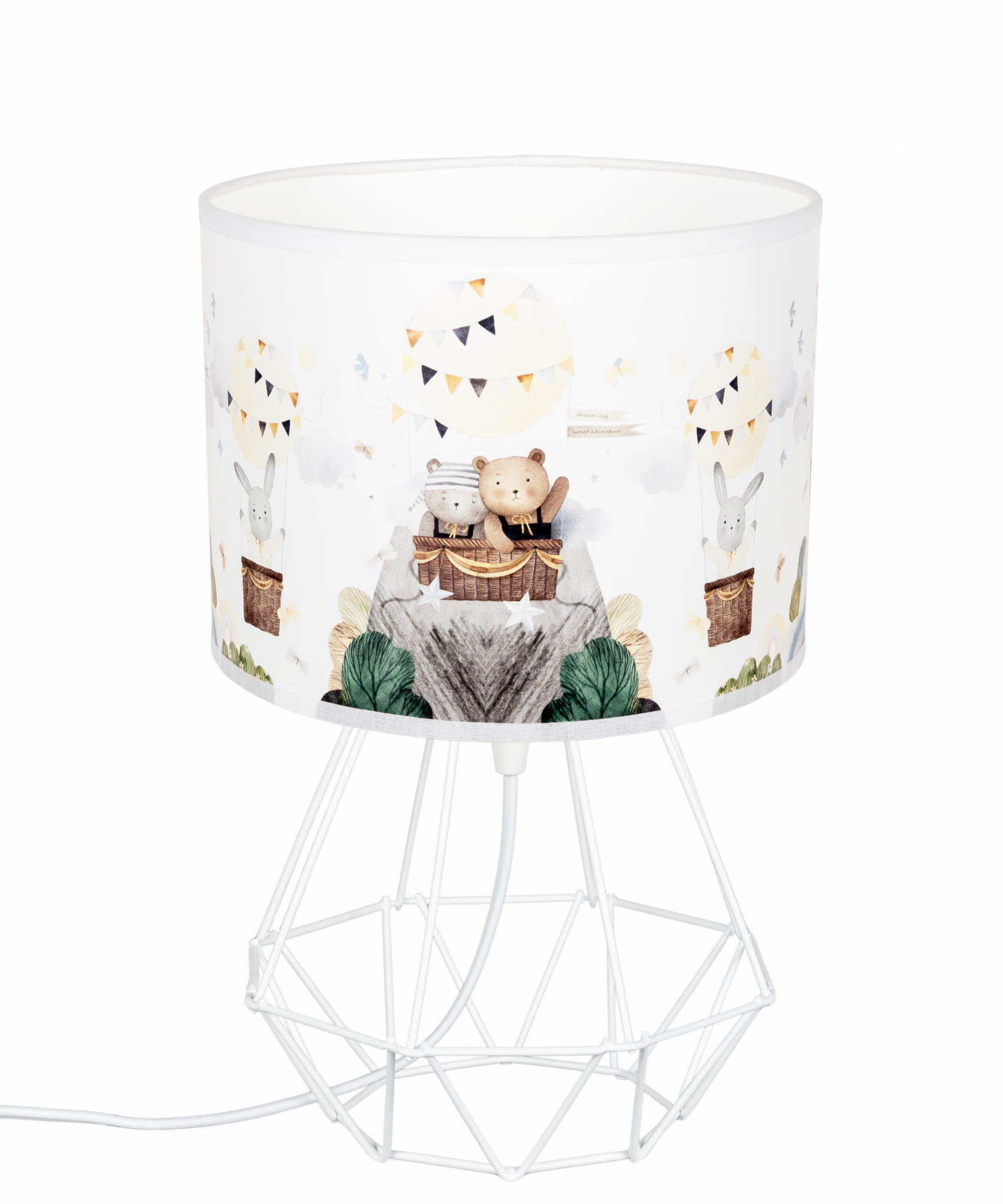 Lampka do pokoju dziecięcego. Abażur szyty. Wydruk wzoru na folii wykonany jest wodnymi farbami ekologicznymi - nie pozostawia intensywnego zapachu w pomieszczeniu, jak to się dzieje w przypadku wydruku UV. W ofercie można dokupić także zwis oraz kinkiet z takim samym wzorem.