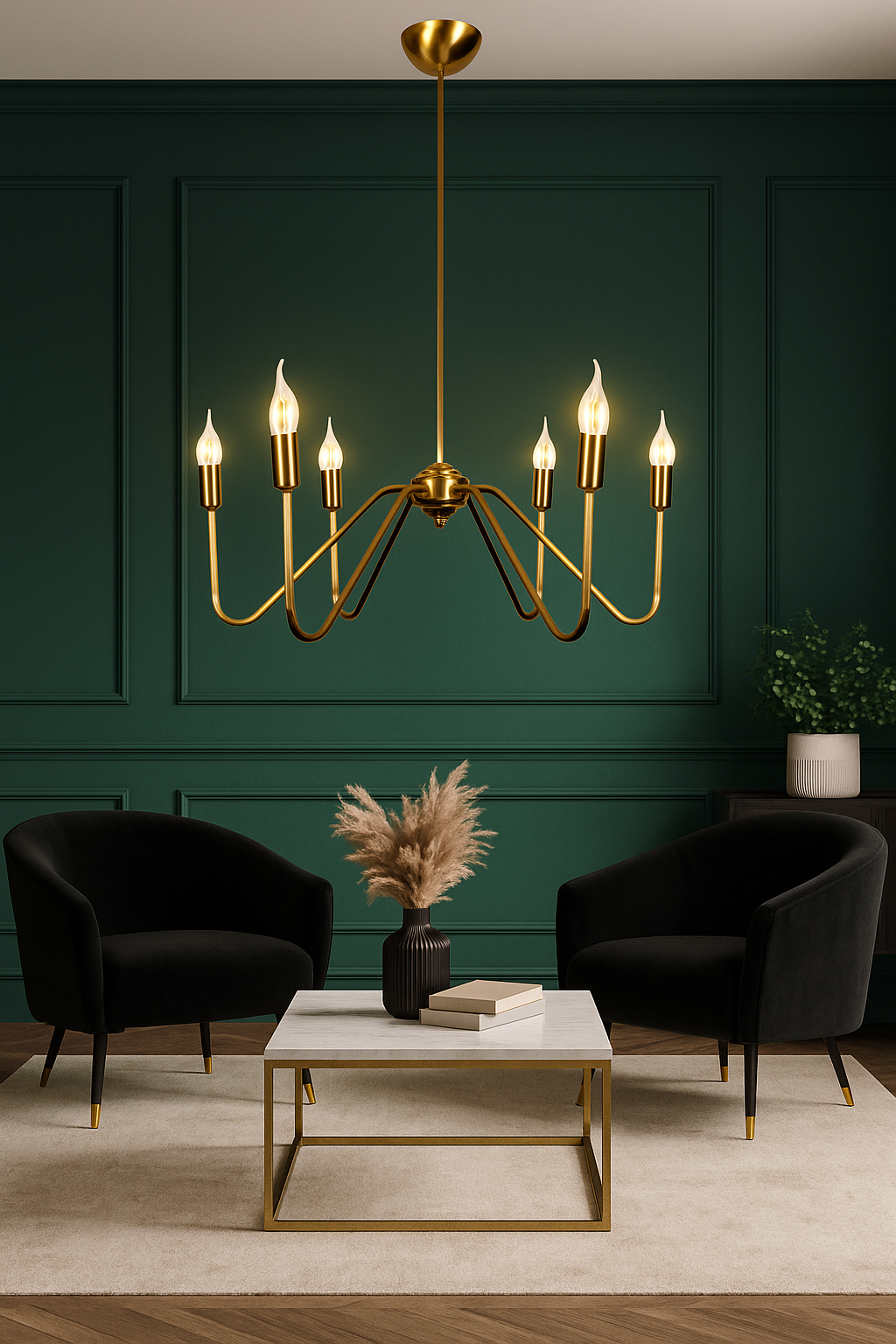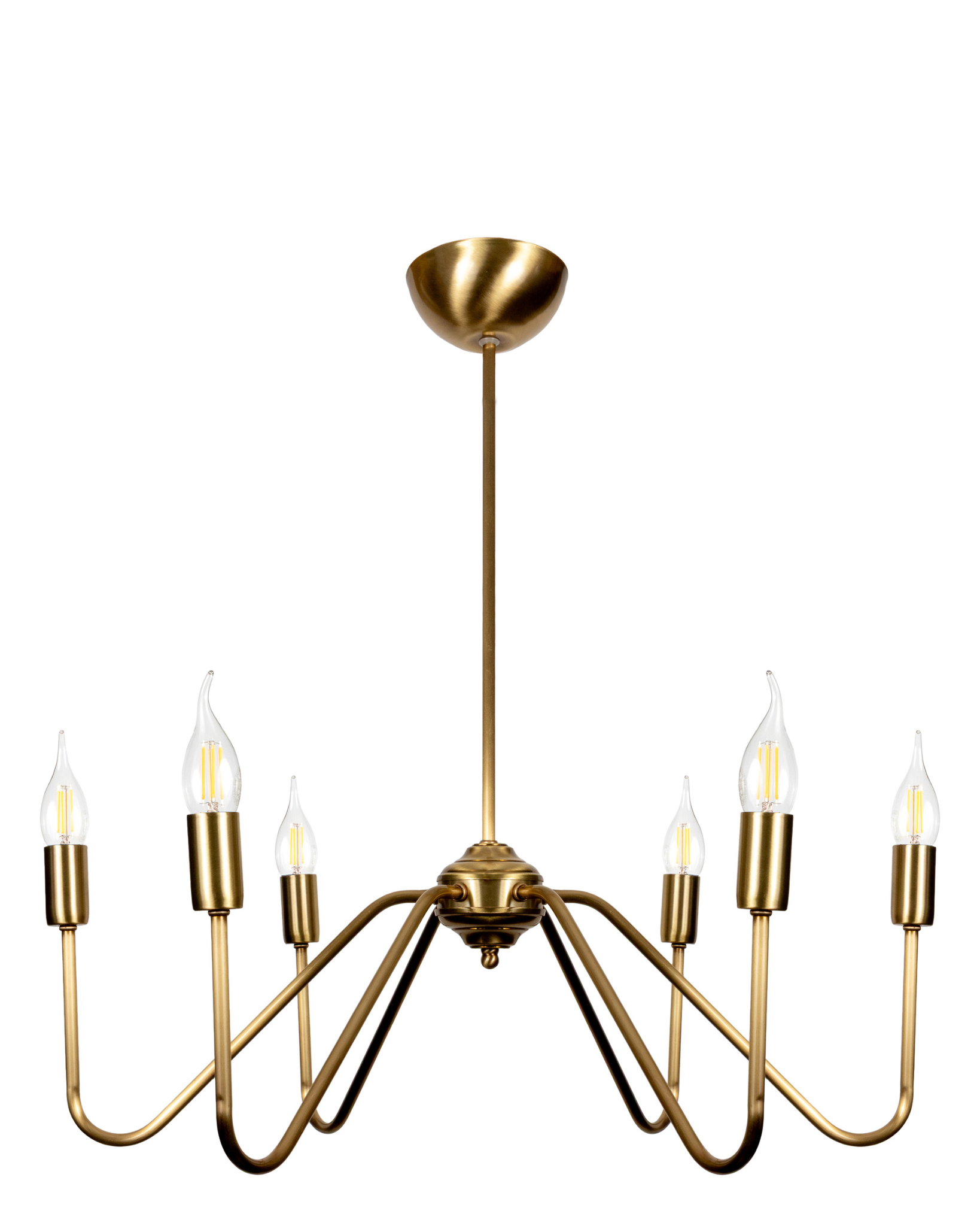 Wprowadź elegancję i ponadczasowy styl do swojego wnętrza dzięki złotej lampie wiszącej LED z 6 ramionami, idealnej do jadalni, salonu czy kuchni w stylu modern farmhouse lub nowoczesnym. Wykonana z wysokiej jakości mosiądzu w patynowanym wykończeniu, lampa łączy klasyczną formę świecznika z minimalistycznym designem. Wyposażona w 6 energooszczędnych żarówek LED typu "płomyk", tworzy ciepłe, przyjemne światło, które doskonale dopełni atmosferę każdego pomieszczenia.