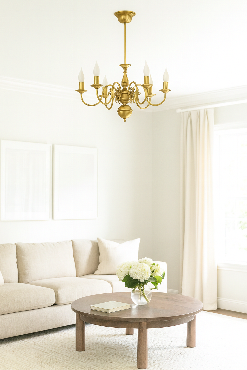 Klasyczna lampa z mosiądzu na sześć ramion, żyrandol mosiężny świeczkowy Flamand.